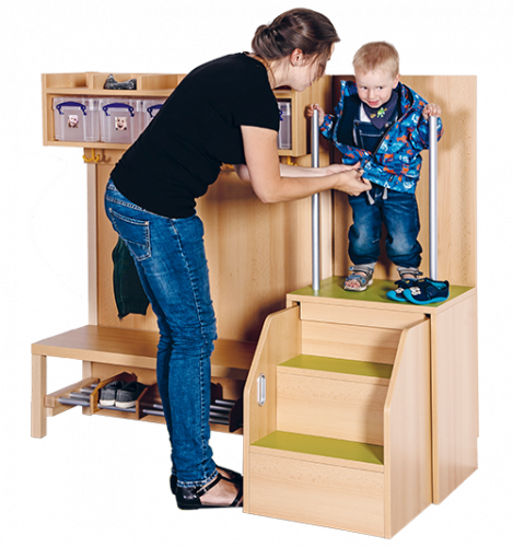 Die praktische Anziehhilfe aus feuerhemmendem B1-Material mit Buche-Dekor lässt sich in Garderobenanlagen integrieren, kann aber auch einzeln montiert werden. Das Kind kann sich beidseitig an stabilen Haltestangen festhalten, während es beim Anziehen geholfen bekommt. Die Stufen der Aufstiegshilfe sind ausziehbar, damit steht die Anziehhilfe bei Nichtbenutzung platzsparend vor der Wand. Stufen und Podestebene sind mit wasser- und kratzfestem Linoleum belegt, sie sind damit widerstandsfähig und trotzdem leicht zu reinigen. Die Podesthöhe beträgt jeweils 60 cm. Die Linoleumfarbe ist wählbar.
