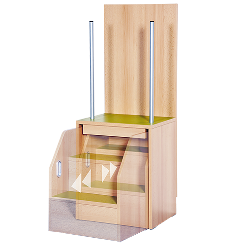 Die praktische Anziehhilfe lässt sich in Garderobenanlagen integrieren, kann aber auch einzeln montiert werden. Das Kind kann sich beidseitig an stabilen Haltestangen festhalten, während es beim Anziehen geholfen bekommt. Die Stufen der Aufstiegshilfe sind ausziehbar, damit steht die Anziehhilfe bei Nichtbenutzung platzsparend vor der Wand. Stufen und Podestebene sind mit wasser- und kratzfestem Linoleum belegt, sie sind damit widerstandsfähig und trotzdem leicht zu reinigen. Die Podesthöhe beträgt jeweils 60 cm. Das Korpusdekor und die Linoleumfarbe sind wählbar.