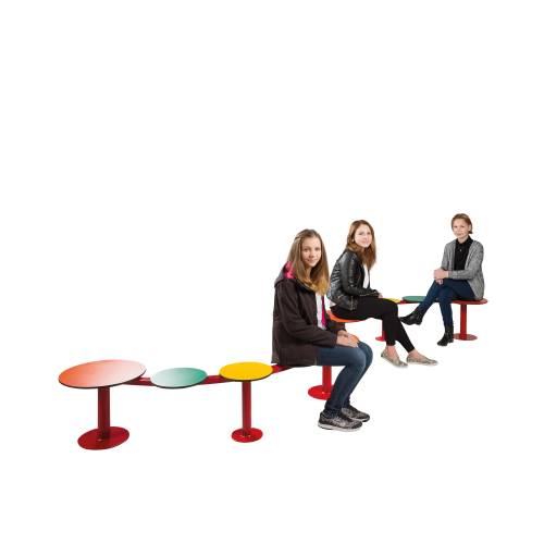 Einzigartig auch dahingehend, dass die beiden Teller an den Enden auch als Abstelltisch funktionieren, die mit weiteren der Sorte kombiniert werden können um eine weitere interessante, einladende Struktur zu schaffen.