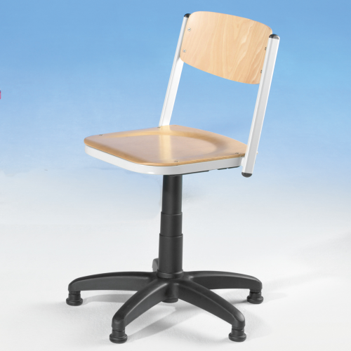 Unser Drehstuhl mit verdecktem Gaslift, ist von 39 bis 52 cm höhenverstellbar. Er steht auf einem fünfstrahligem schwarzen Polyamid-Fußkreuz mit Kunststoffgleitern.