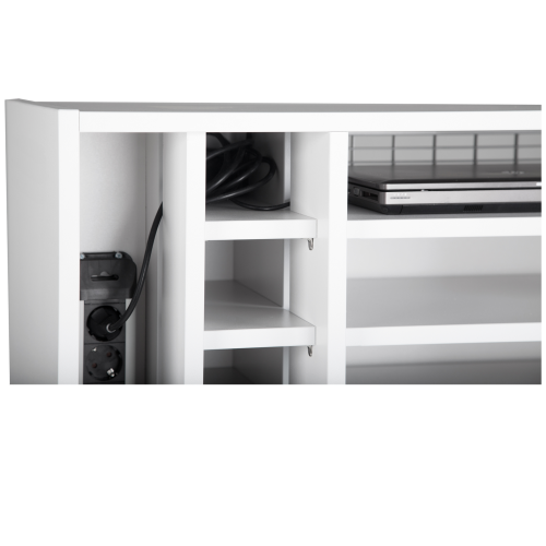 Das Notebookregal bietet Platz für 13 Notebooks bis zu 17" (Fachmaß: B/T 50x34 cm). Auf der rechten Seite befinden sich 2 x 8 Steckdosenplätze, die 2 Steckdosenleisten sind separat schaltbar. Die Notebookfächer befinden sich auf der linken Seite. An der Rückseite befinden sich zwei Lüftungsgitter. Eine zurückgesetzte Rückwand von 10 cm sorgt für zusätzlichen Stauraum von Kabeln und Zubehör.