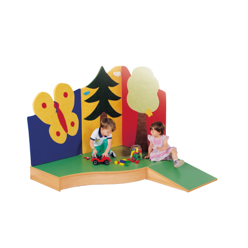Die 2 mm - ABS Sicherheitskanten an der Podestplatte aus 19 mm E 1-Feinspanplatte gewährleistet eine beanspruchungsfähige Kante, die den täglichen Beanspruchungen auch auf den geschwungenen Konturen ohne weiteres standhält. Der Oberplattenbelag besitzt eine strapazierfähige und pflegeleichte Oberfläche, er besteht aus geräuschdämmendem Linoleum und ist kratzfest, abwisch- und desinfizierbar, die Linoleumfarbe ist aus mehreren fröhlichen Farben wählbar. Das Dekor des Podestkorpus wird ebenfalls in mehreren Varianten angeboten: bitte wählen Sie bei der Bestellung!