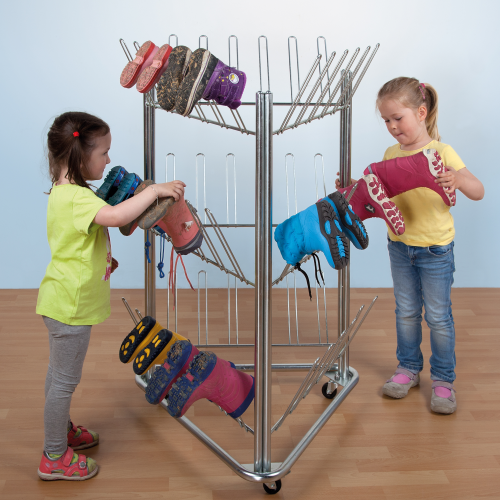 Unser Stiefeltrockenwagen ist perfekt für Ihren Kindergarten geeignet. Es können bis zu 27 Paar Gummistiefel oder andere Schuhe darauf getrocknet werden.