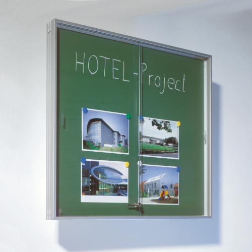 Unsere Wandvitrine für den Innenbereich mit Aluminiumprofilrahmen und grüner Stahlrückwand, ist mit Kreide beschreibbar, feucht abwischbar und magnethaftend. Sie kann in 3 verschiedenen Größen bestellt werden. Die Schiebetür ist aus Sicherheitsglas gefertigt und abschließbar.