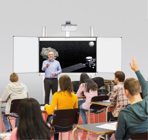 Die Projektionsfläche ist matt weiß, mit Whiteboardmarkern beschreibbar und trocken abwischbar. Sie ist zur Nutzung mit Ultrakurzdistanzprojektoren geeignet. Zusätzlich dazu ist die Mittelfläche des Whiteboards magnethaftend. Der schwarz eloxierte Rahmen sorgt für einen guten Kontrast und besitzt Sicherheits-Eckkappen.