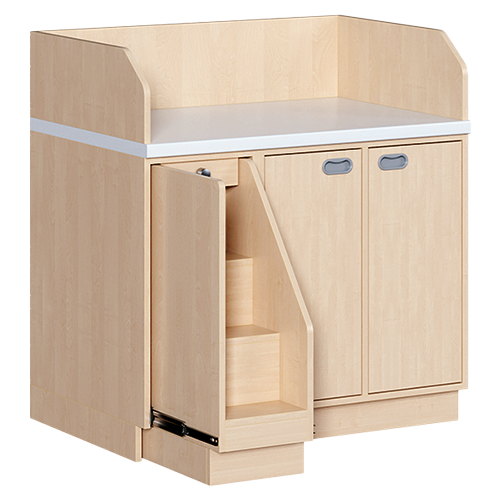 Ob als einzeln aufgestellter Wickelschrank oder als große Wickelkombination - in jedem Fall bieten die verschiedenen Elemente der Wickelkommoden langlebige Materialien, geprüfte Sicherheit, ergonomische Maße und zudem viel Stauraum. Dreiseitige Sicherheits-Aufkantungen umranden die Arbeitsplatte, die vorn benutzerfreundlich gerundet ist und über eine beschichtete und damit wasserabweisende Oberfläche mit zusätzlichen antibakteriellen Eigenschaften verfügt. Eingelassene Griffe und der zurückgesetzte Sockel gestatten ein nahes Herantreten an den Wickelplatz. Als Ausstattungen sind verschiedene Varianten rückenschonender Aufstiegshilfen, Schübe, sowie Kinderbadewannen und Handwaschbecken erhältlich. Optional ist eine besonders wasserfeste Sockelvariante lieferbar. Es kann zwischen zwei verschiedenen Arbeitstiefen und Rechts/Links-Varianten der Schränke gewählt werden. Die Belastbarkeit beträgt bis zu 75 kg. Die Wickelauflage ist separat zu bestellen (Art.Nr. "WIC P..." in der jeweiligen Breite und Tiefe).