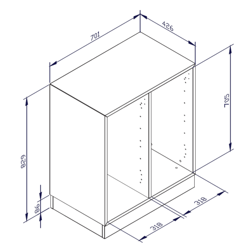 Die Sockelhöhe beträgt 8,6 cm. Beim Einsatz von optional erhältlichen Rollen verändert sich die Sockelhöhe nicht. Die Materialstärke der Wände und der Fachböden beträgt 19 mm, die feste Rückwand ist 8 mm stark und garantiert eine hohe Stabilität.